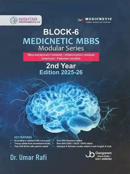 Block 6 MEDICNETIC MBBS Modular Series 2nd Year Edition 2025-26 is carefully designed for MBBS students who want a clear and updated understanding of their subjects. Authored by Dr. Umar Rafi, this edition follows the UHS curriculum and provides structured coverage of each topic from the Neurosciences module, Inflammation module, Islamiyat, and Pakistan Studies.