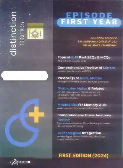 Episode First Year Distinction Diaries 1st Edition by Dr. Ali Raza Chaudhary, along with Dr. Anas Farooq and Dr. Muhammad Seerat Ali, is a modular review guide designed for MBBS First Year students studying under UHS, NMU, RMU, FMU, and AJK. This exam-ready approach focuses on helping students master their first-year syllabus efficiently. Covering minor subjects, anatomy reviews, and high-yield content, the book offers a structured pathway for both theory and practical learning.