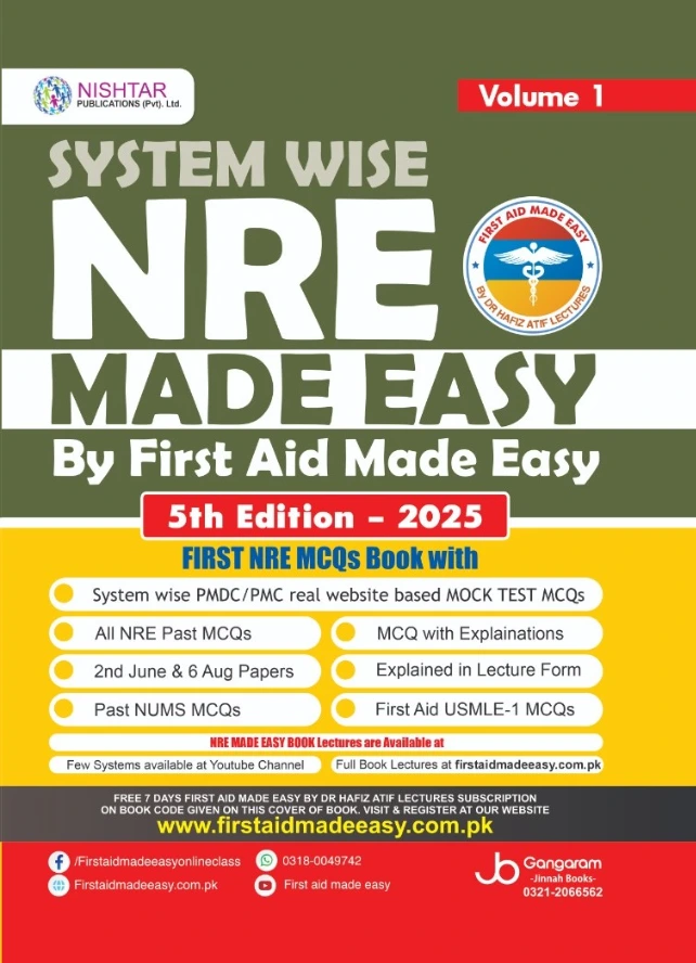 System Wise NRE Made Easy 6th Edition 2025 (2 Volume-Set) is a well-structured resource for medical students preparing for the National Registration Examination (NRE) and other healthcare-related exams. Authored under the guidance of Dr. Hafiz Atif, the book integrates system wise PMDC/PMC mock test MCQs, past NRE MCQs, and NUMS papers, offering a comprehensive pathway to strengthen exam strategies. With lecture form explanations, updated syllabus coverage, and first aid USMLE-1 MCQs, it is designed to support both local and international exam preparation.
